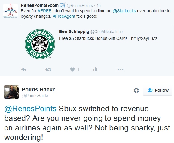 Look at this next tweet where PointsHackr commented to my tweet. Also peek at both Starbucks stock and Delta stock since April. Notice anything similar. Yeah, down, down, down from the highs. I think, and those in the investment community as well, think only negatives are on the way. I agree (disclaimer: I never buy/sell any airline stocks). What could help fix this? You betcha – loyalty and loyal customers who always and only buy Delta tickets.