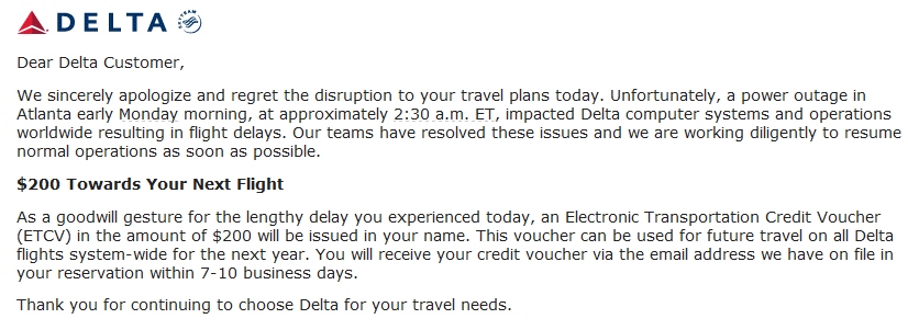 The above is a screen shot from the generic e-mail Delta Air Lines has sent out to those who were affected by the mostly week long flight cancellations, delays and disruptions. But exactly why did Delta do this? Did you know they did not have to provide you with anything at all? Yep, if we are talking domestic flights all they had to do was at some point get you from A-B or give you a full refund. Seriously, if you don’t believe me read the COC or contract of carriage that you agreed to when you purchased the ticket (but I am sure you did not take the time to read).