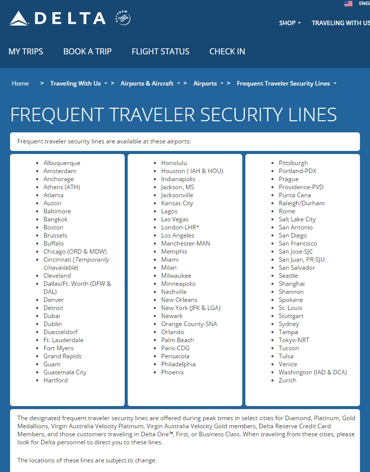 “The designated frequent traveler security lines are offered during peak times in select cities for Diamond, Platinum, Gold Medallion®s, Virgin Australia Velocity Platinum, Virgin Australia Velocity Gold members, Delta Reserve Credit Card Members, and those customers traveling in Delta One™, First, or Business Class. When traveling from these cities, please look for Delta personnel to direct you to these lines.”