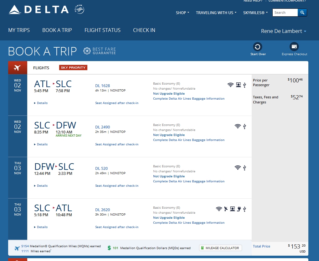 HURRY! Atlanta to Dallas (via SLC) $153 & 5154MQMs at 3CPM weekday Delta Elite Mileage Run