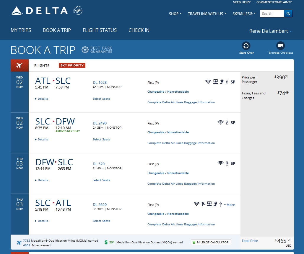 HURRY! Detroit to Orlando (via SLC) 1st class $489 & 10232 MQMs at 4.8CPM Delta Elite Mileage run