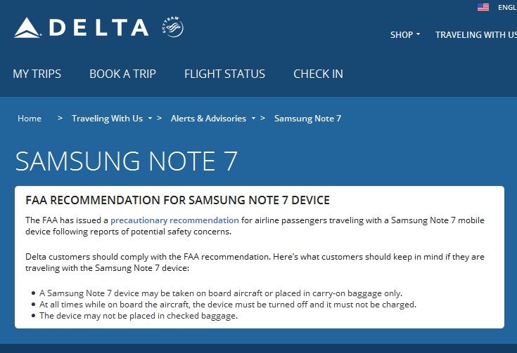 It’s not just Delta that is urging people not to use the Note 7, FAA Statement. I flew DFW-MSP today and I heard several airlines issuing that same notice.