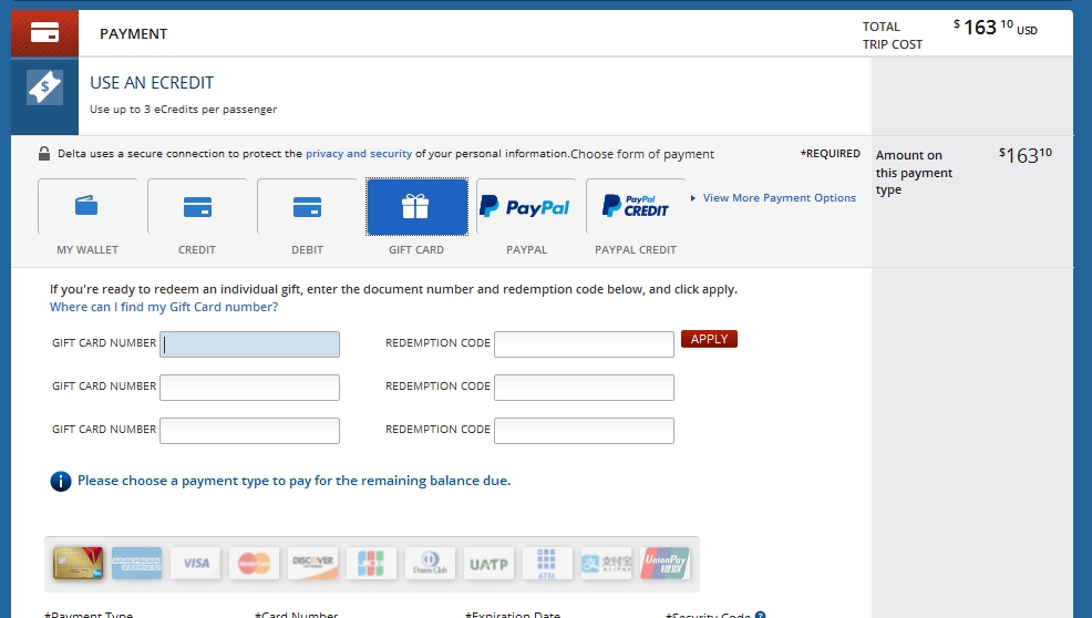 I really hope this is a intentional change and improvement by Delta and not a glitch but by the wording on the checkout page it sure seems like it is a planned upgrade and I am thrilled. Delta makes all kinds of bump or other eCredits hard to spend by restricting them to you only (or someone with you on the same ticket). Being, at long last, able to apply up to 3 eCredits just like eGift cards is a solid step in the right direction.