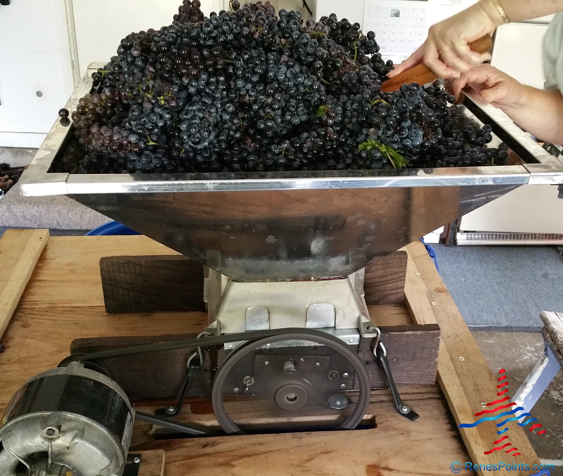 We like to do all the steps ourselves. We begin with grinding the grapes with an Italian made crusher that is run by a small motor. While the crushed mash may not look that appealing it is pure delight for the yeast we add (I add vs using the natural yeasts for better control and final product).