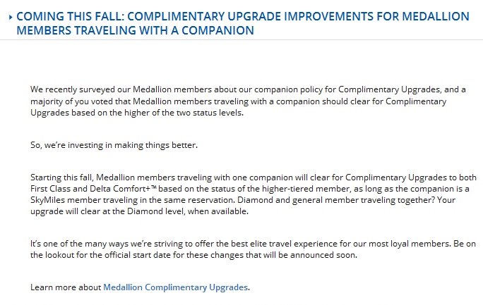 Next up we have an update for the outstanding news that broke back in May that soon your +1 (on the same reservation or PNR) will have a chance to upgrade to both C+ seats with you and 1st class seats as well on your medallion level. There have been unsubstantiated rumors that Delta is changing what has been published. I very much doubt that and any walk-back of what is in print would be very bad. Either way, at this point, the only news we know is we still have to wait a bit longer for the program changes to begin. Yes, it is already fall. Yes, I hate waiting too.