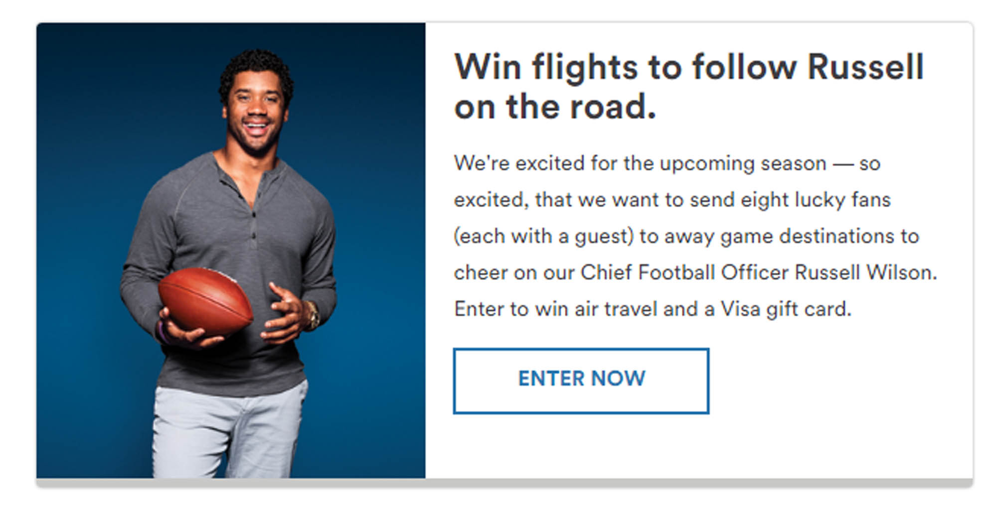 We know the importance of having supportive fans in the stands, both at home and on the road. To help Russell’s fans support him all season long, we are offering a 12% discount on air travel to most away games if you are traveling from WA, OR, ID, MT, AK, or British Columbia. Alaska Airlines also has a promotion to allow fans to win free flights to cities where the Seahawks are playing.