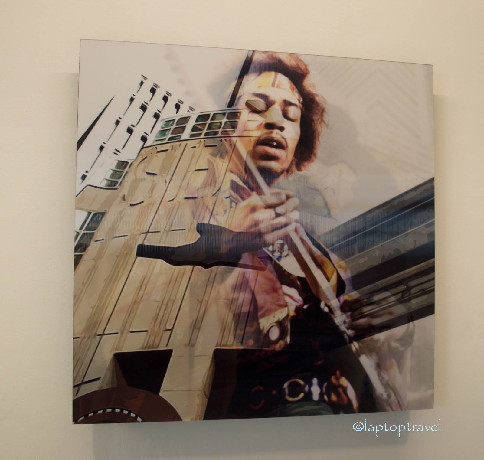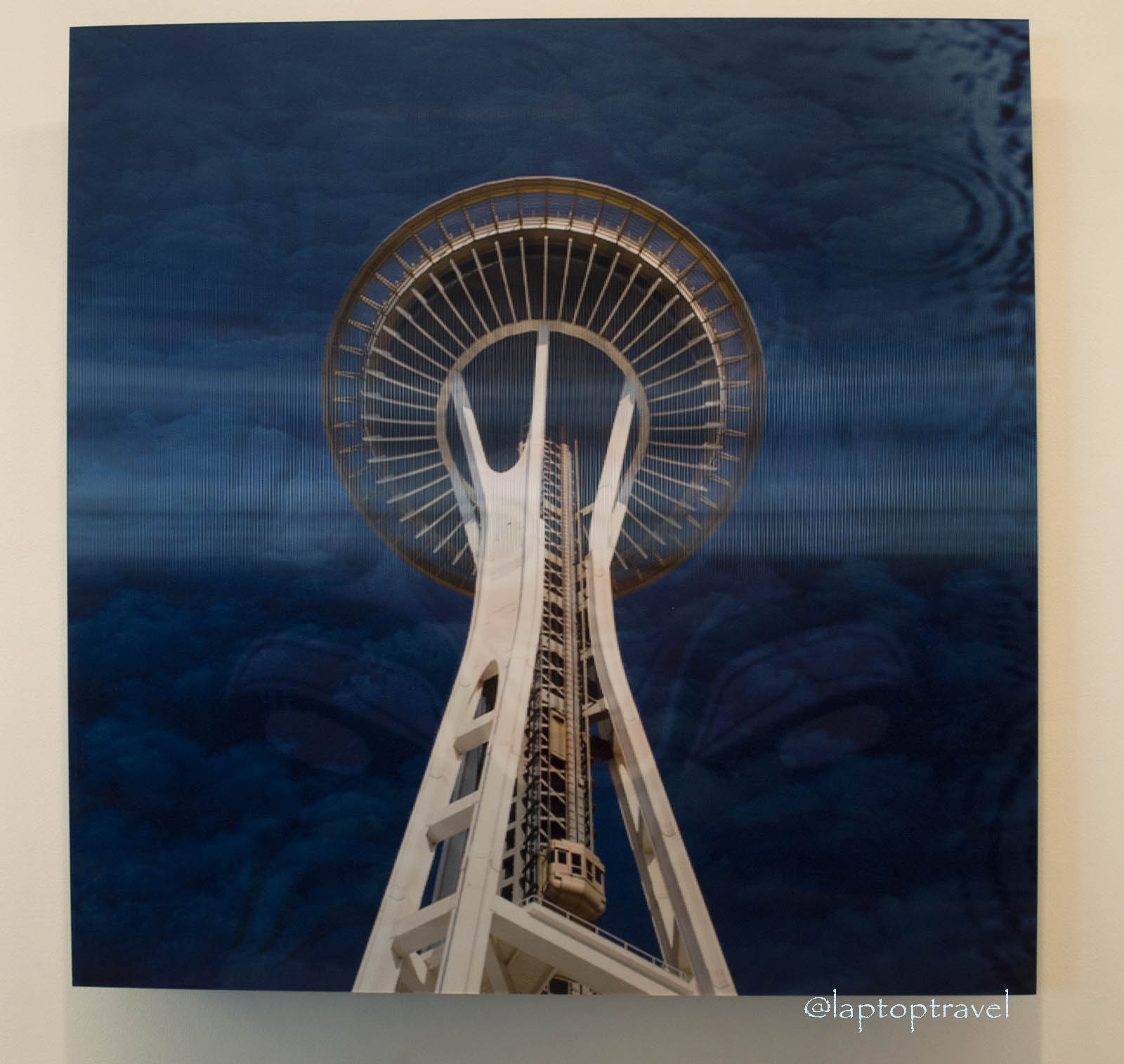 My favorite piece has to be the work of Atlanta studio artist and photographer Craig Allan McMillan, who has produced the San Francisco Sky Club’s mural of the Golden Gate Bridge. Craig was on hand at the event, and I got to chat with him for a bit. He even presented me with a personally noted and signed print of the Pike Place Market mural piece which hangs above the full service desk of the club.