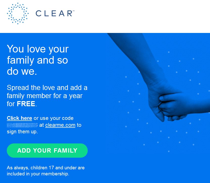 Well now, for a limited time, CLEAR is sending out emails with a PVT one time code (edit: sorry folks was misled by CLEAR Twitter folks, see link below) to add a +1 for FREE for one year. Outstanding news if you have not added your +1 yet. But that brings up some questions that I asked CLEAR about this promo: