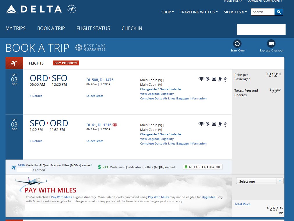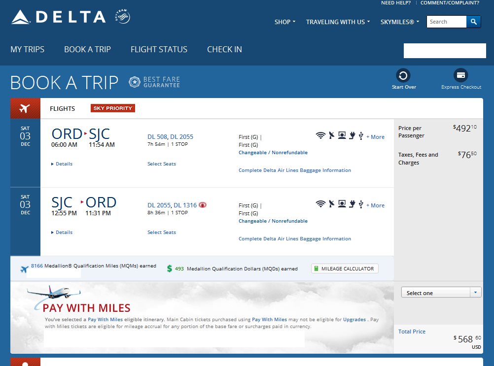 There is a lot to like about either one of these two runs if you are a Delta flyer out of Chicagoland area. While the price is a tad bit high at almost 5 CPM it is a weekend run and one you can do all in one long day. Plus, since it is on a weekend your upgrade chance should be higher than normal and out of SFO all upgrades are hard period. The other one is to San Jose all in 1st class and at a very respectable sub 7 CPM. I like running in 1st class both for the experience and the bonus MQMs for fare class.
