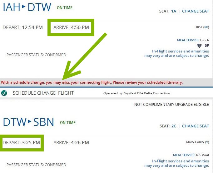 Do you notice a tiny little problem with the info from “My Delta” and my reservations above. Do you see what time I land and what time my next flight departs? And lastly notice the wording where the arrow points? Yeah, if not so sad it would be funny. And here is the really frustrating part: