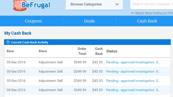 Let’s start with this first one as I think a number of you got in on the amazing deal that let you save literally hundreds of dollars on Dell buys over Cyber Monday when you add in the AMEX SYNC offer. I got 4 laptops and flipped them in a day on Ebay. All in, after costs, I only made about $35 each unit. So I was really looking forward to the money back from BeFrugal but it was not showing up. I had to start a tracking ticket on each order and they have now confirmed I will be paid for the clicks. You may want to do the same if you are not tracking for your orders!