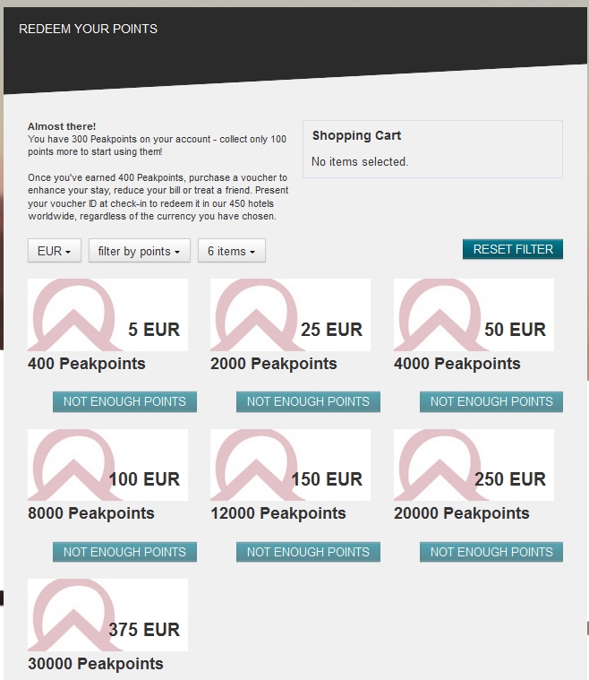 The airport hotel participates in a rewards program I have never heard of that is it is “new” to me. Well, why not join it! Plus it accomplishes my point 5 on the list above. It is called WorldHotels PeakPoints. I sign up and get 300 points. Unfortunately it takes 400 to get anything, but my stay will help me do that. Then for my next stay: