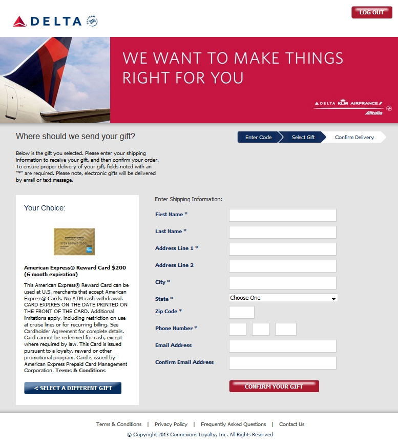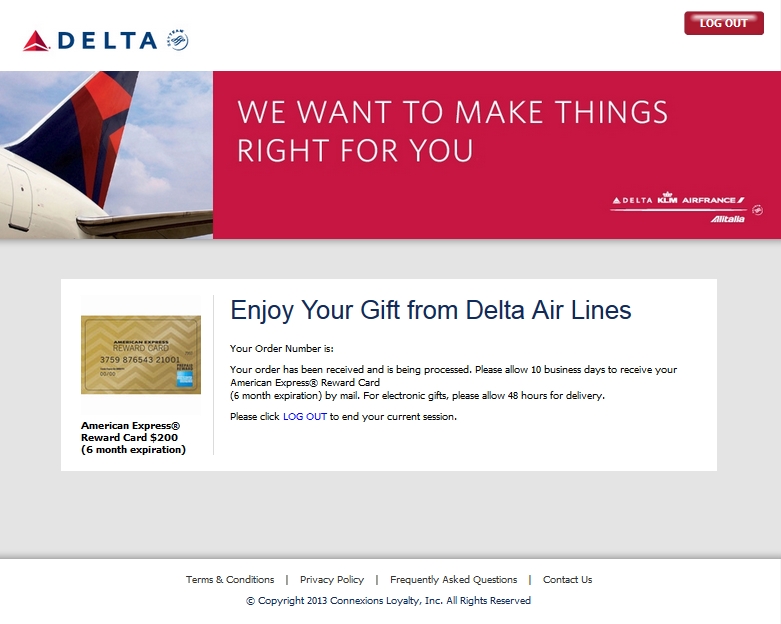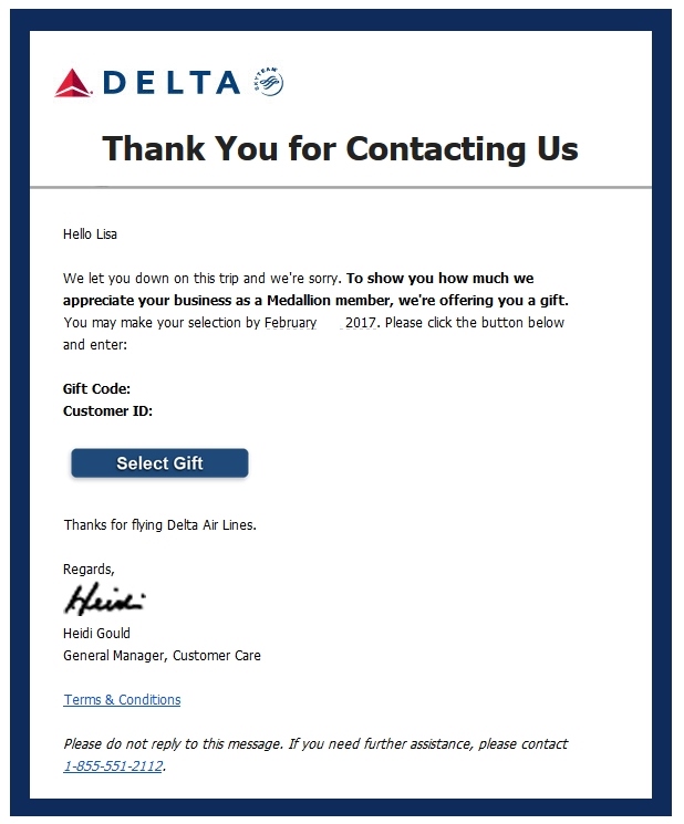 Time to contact Delta on Delta.com. Within hours an e-mail arrived that Delta was sorry about what happened and would like to not just offer her the promised voucher but a choice of a gift card. OUTSTANDING!