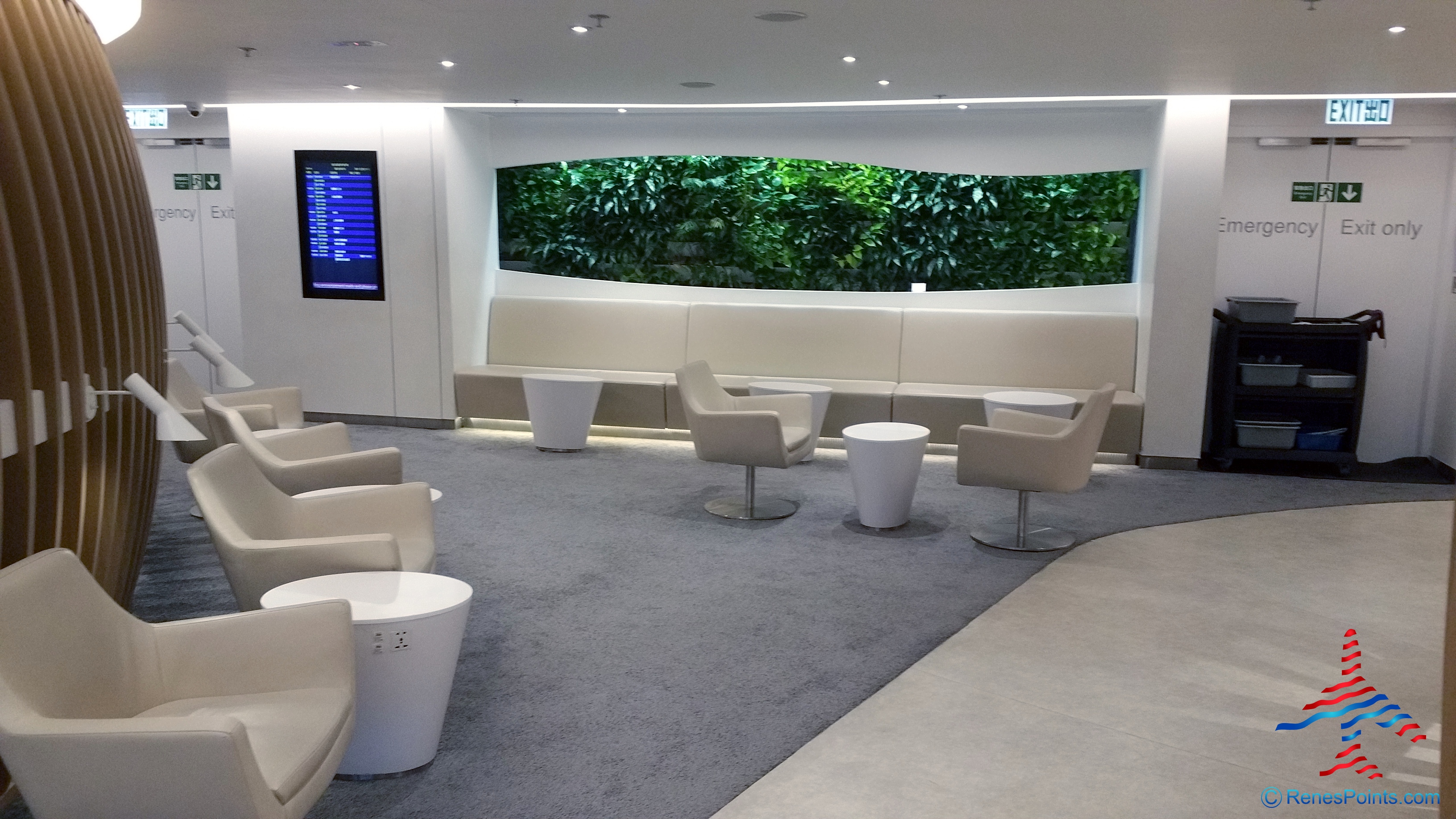 The lounge is downstairs but due to bright white paint does not quite have the same “grotto” feel that say the Alitalia lounge has in Rome.