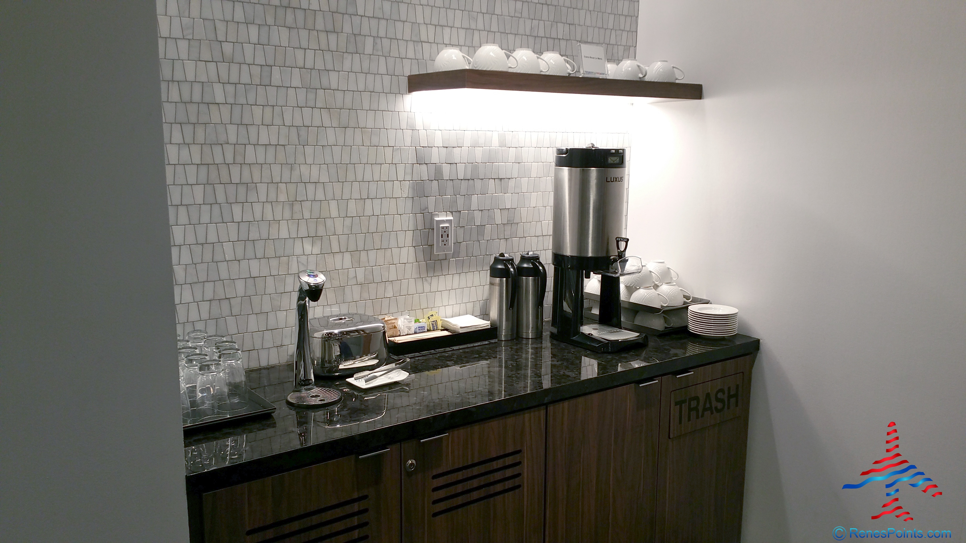 The next big space is the large bar (where all drinks are complimentary) as well as the food service space. Compared to other lounges AMEX does offer, most times, a decent choice of real food choices.