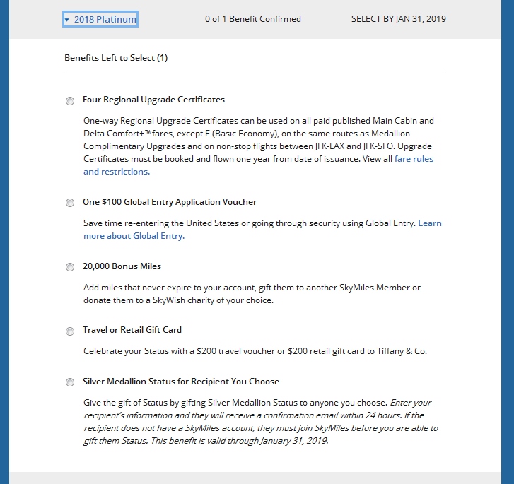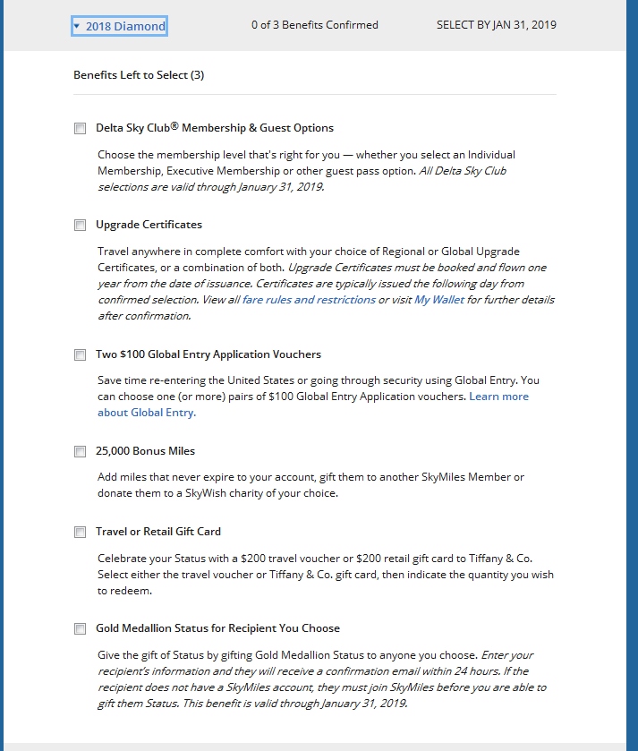 Choice Benefits is based upon a Status change to Diamond or Platinum Medallion® within a given Status year. Members who qualify for 2018 Status in 2017 will only be eligible for 2018 Choice Benefits. Choice Benefit selections for 2017 status need to be made by January 31, 2018; selections for 2018 Status need to be made by January 31, 2019. Once redeemed, Choice Benefits cannot be exchanged or replaced. Diamond Medallion® Members may not select the same Choice Benefit twice for their Diamond selection for their 2017 Medallion® year selections; they may choose the same benefit as their Platinum selection and one of their two Diamond selections. Diamond Medallion® Members may only select Upgrade Certificates or Delta Sky Club access once for their 2018 Medallion® year selections.
