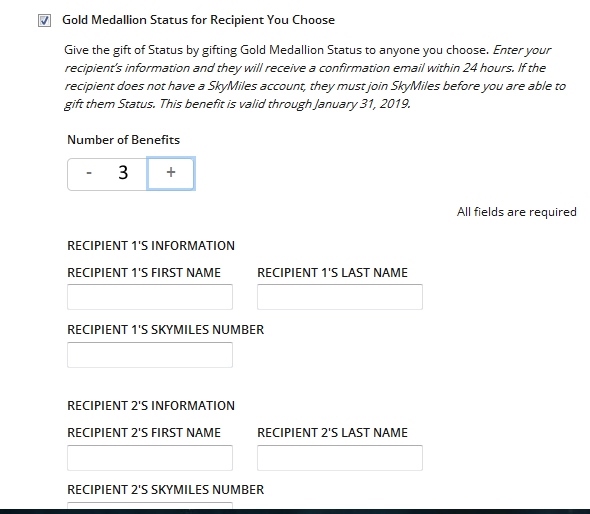 One thing I just had not even considered this very early morning when I took the post live was the implication of most of the choices being able to be chosen over and over. Sure most of us looked inward at the option to choose 25,000 SkyMiles 3 times for yourself (we are greedy, are we not). But one I missed was the option to gift Gold Medallion® status 3 times to someone should you choose to do so. Interesting, right. Then my friend and frequent blog contributor @laptoptravel commented: