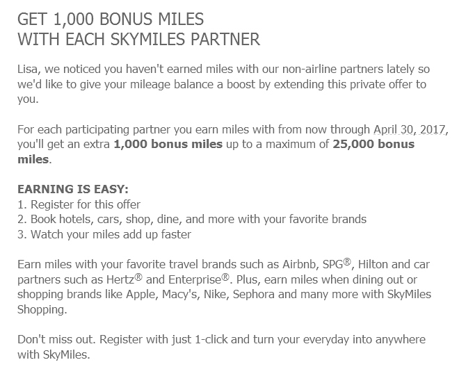 “1,000 miles for every participating non-airline partner they earn miles with between February 1, 2017, and April 30, 2017”