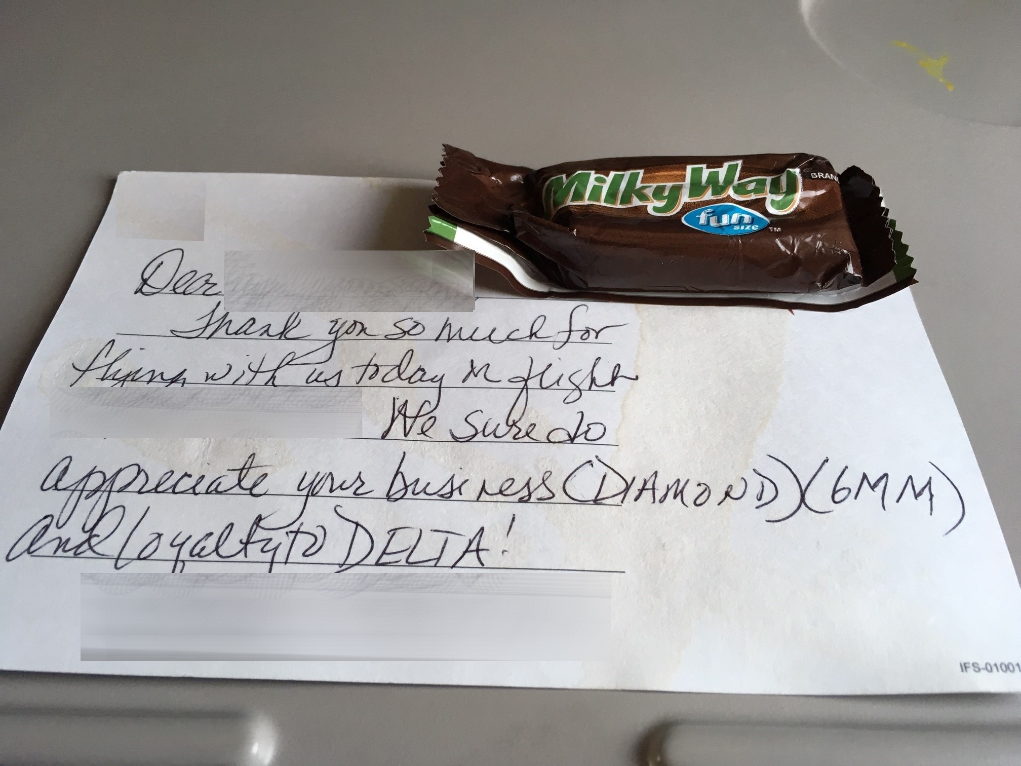 I have flown over 6 million miles and still get the opportunity to sit in main coach on the majority of my trips. Added benefit: an obligatory thank-you card and a smashed Milky Way bar. My alliance with DL diminishes daily!”