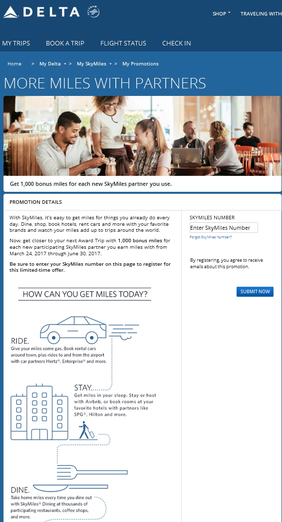 Now, get closer to your next Award Trip with 1,000 bonus miles for each new participating SkyMiles partner you earn miles with from March 24, 2017 through June 30, 2017.