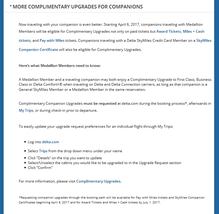 *Requesting companion upgrades through the booking path will be available for Pay with Miles tickets and SkyMiles Companion Certificates beginning April 6, 2017 and for Award Tickets and Miles + Cash tickets by July 1, 2017.” – Delta.com