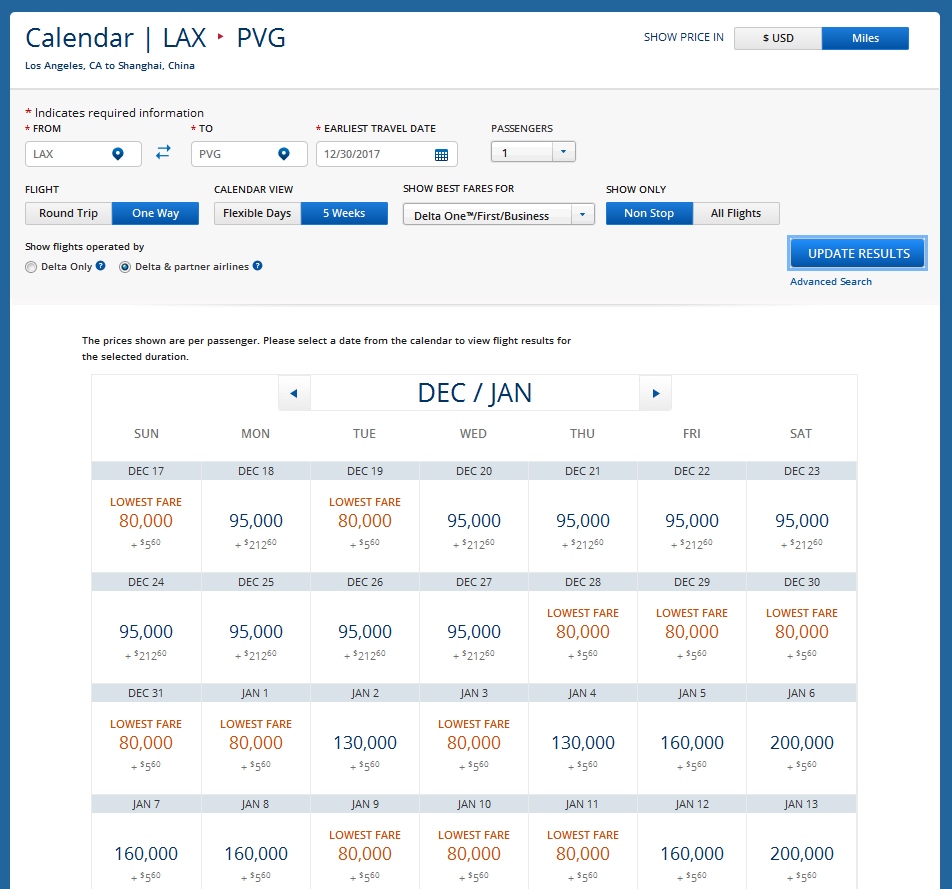 Another example would be to Asia and we see in the above search Delta One ie Delta metal flights remain at 80,000 or a Level 1 award price but partners have jumped to 95,000 points or about a 19% jump and in coach from 35,000 to 40,000 or about a 14% increase.
