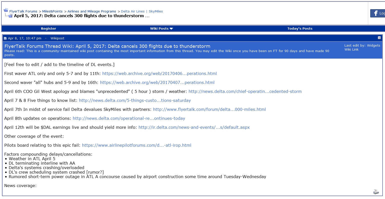 Then there is a thread to follow on FlyerTalk about the latest and “greatest” about the #DeltaMeltDown and specially the Wiki at the top of the thread (a box almost anyone can edit). I jumped in and added a number of links and it is becoming a very reliable source to get info since the Delta mothership is providing little real useful info on what is going on and just how bad the situation is. How bad is it you ask? Notice what reader “Bob” sent me as just one example of how bad: