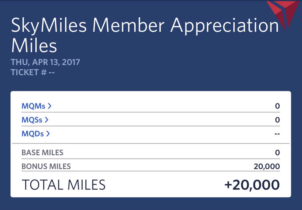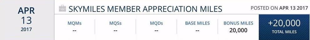 Well over the past few days Delta has been quietly dumping SkyMiles into most elite’s accounts who were flying 3rd-9th this month. These two screen shots are some examples of the “SkyMiles Member Appreciation Bonus” you are likely to get or already have in your account now if you log in and check.