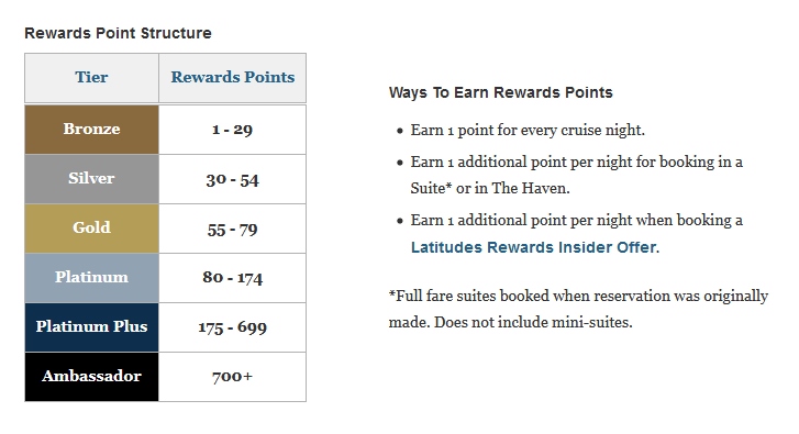 Since I am jumping back in, like with all things travel, I don’t want to be just “anyone”. I want to hold as close to top status as I can with the cruise line. And when I took the time to really look at it, with reasonable goals, that means reaching Platinum status with the new updated NCL elite/rewards program. Thankfully, unlike some hotels chains that come up with simply ridiculous elite names (hello Hyatt-ist) theirs are reasonably simple and can be compared to airlines and other elite programs and names.