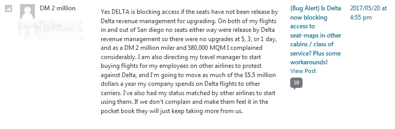 Next today an interesting and unconfirmed comment from a reader. I have no idea if this person really spends 5.5 Million (yes Million) flying on Delta each year and they did not leave their real name anyway. But if the person is honest and really does pull that kind of spend with Delta, and others do as well, I can see the lack of upgrades and 20×2020 (selling all but 20% of 1st class seats by 2020) driving high spenders away from Delta. There is always a fine line in any business and loyalty is becoming a thing of the past with airlines including Delta!