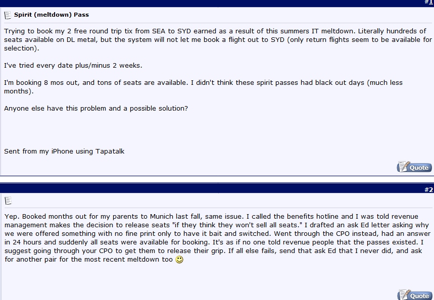 Next up I found a funny exchange on a Delta pilots board about the “free” passes Delta handed out to all the employees during one of the 3 (or all of the 3 – hard to keep track) Delta meltdown events over the past year. It seems our “good friends” at revenue management that makes SkyMiles all but worthless and RU & GU certs so hard to use were also making the promised “free” employee ticket just as hard to use as everything we received. Also that a quick internal letter to the Delta CEO seemed to fix things as Mr. Ham Sandwich does jump when Ed calls (or so it seems anyway).