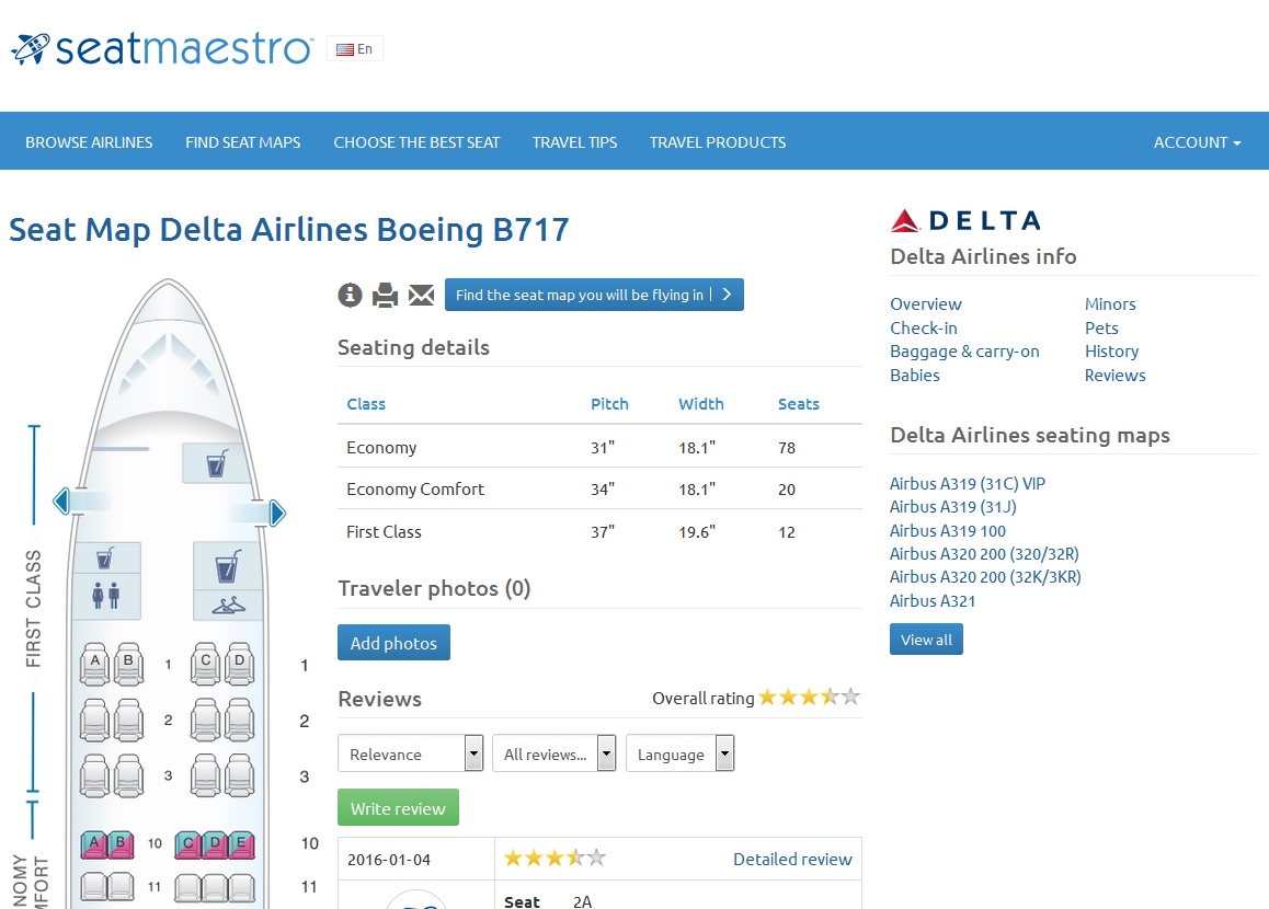 So where do you look to see all the info about the flight you are on? Clearly you can go to Delta.com and look at the most up to date info on what they offer. However, you are not really going to get an objective overview of what seats to avoid and why to avoid them. The Delta page is primarily a sales and marketing tool not a safe guide for good and bad. So time to look at 3 outside sources: