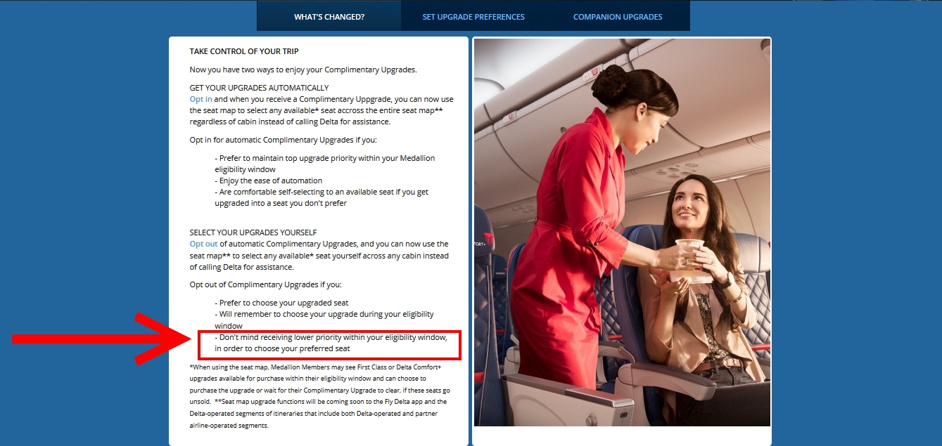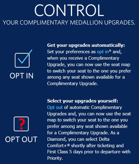 Most of us got the above e-mail with much fanfare about the new Delta upgrade rules changing to hourly-ish (but still the same 5,3,1 day as before) rather than just at the 24 hour window. Delta also seems to want you to “opt-in” to receive Comfort Plus upgrades as well as 1st Class upgrades. But will choosing NOT to receive a C+ upgrade impact your shot at a real upgrade to 1st class upgrade? Notice the scary wording on the Delta page about “taking control of your trip” on Delta.com