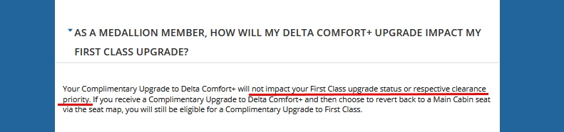 Is Delta here not clearly telling us plainly that by opting out of a C+ (and / or a 1st class upgrade) going to mean that we “don’t mind receiving lower priority” when it comes to upgrades? Some readers have e-mailed me and felt that is exactly what it says and we are hurting there chance for a real upgrade to 1st class if we opt out of C+. I can put your fears to rest because also on Delta.com it says: