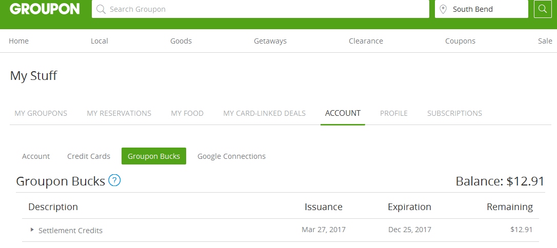 Next up a Groupon issue that I don’t think I ever blogged about but apologies if I have already covered it but since the redemption time is limited I wanted to get this out to you. If you have ever used Groupon you should check to see if you were part of the settlement against them for something they did that was less than above board. I have only used Groupon a few times and got almost $13 as an account credit but as you can see I have to spend that credit before years end. I have now spent mine, first starting at TopCashBack to earn even more (#ProTip), and will be enjoying a nice $30 dinner credit in South Bend for about $3 all-in as the coupon I purchased was 50% off face value. Maybe there are similar deals in your home town as well.