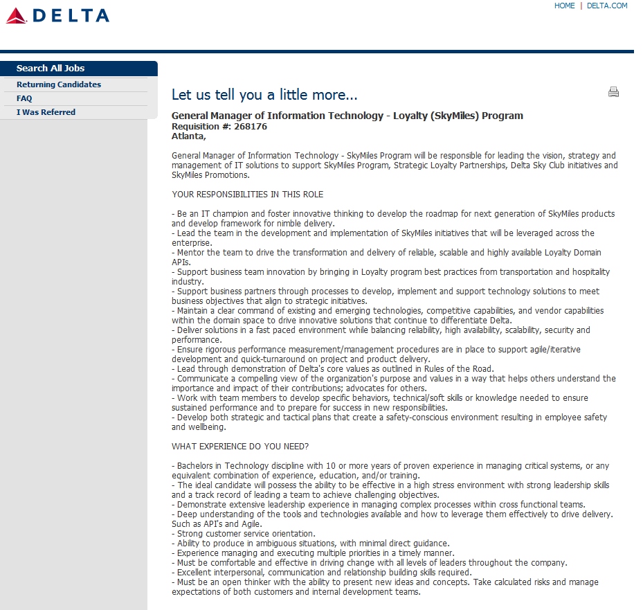 “Be an IT champion and foster innovative thinking to develop the road map for next generation of SkyMiles products and develop framework for nimble delivery. Lead the team in the development and implementation of SkyMiles initiatives that will be leveraged across the enterprise.” from – delta.greatjob.net