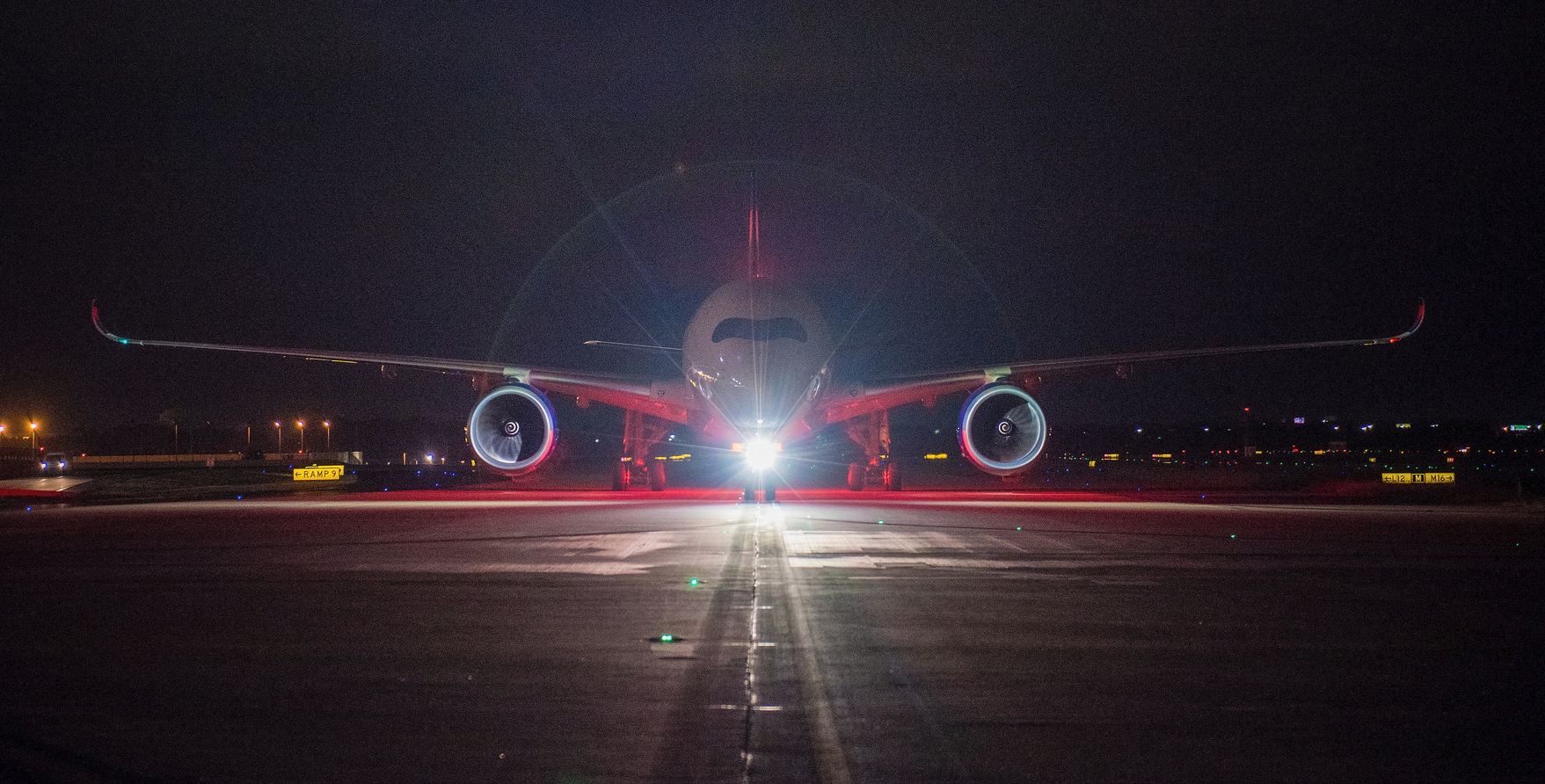 a plane on the runway at night