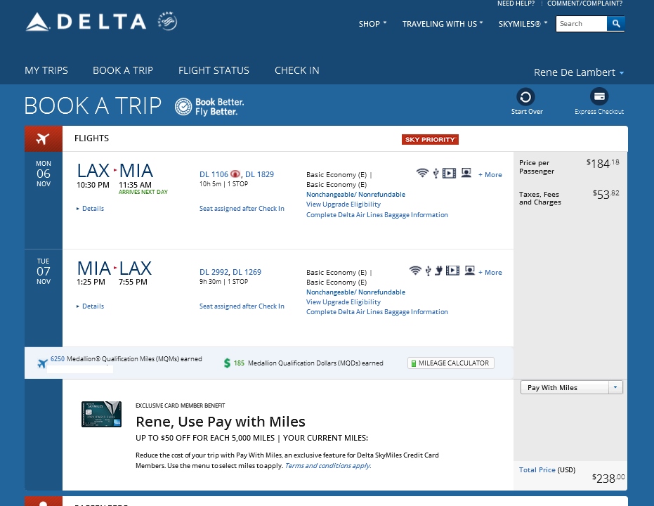 Let me tell ya folks the really good runs, i.e. sub 4CPM (cents per mile for each MQM), are really getting thin. But this one works either in Basic for the cheapest price ie 3.8CPM or at 4.3CPM you can go with an X+ fare class for shot at medallion upgrades on all the legs.