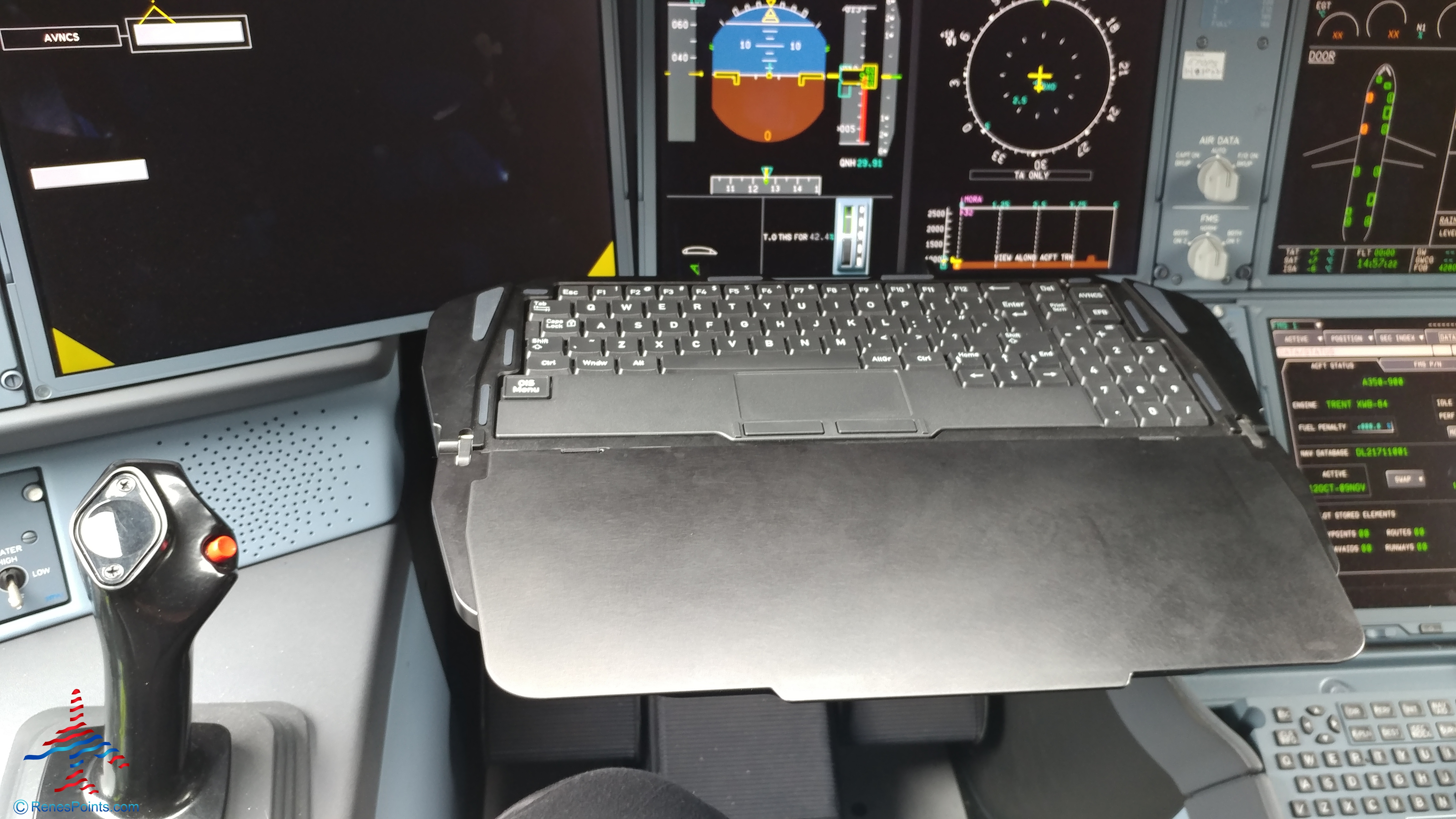 And unlike Boeing that has a yoke in the middle of the seat, the A350 has a control stick to the side and a useful keyboard in the middle (thus allowing you to “drive” with one hand and control thrust with the other).