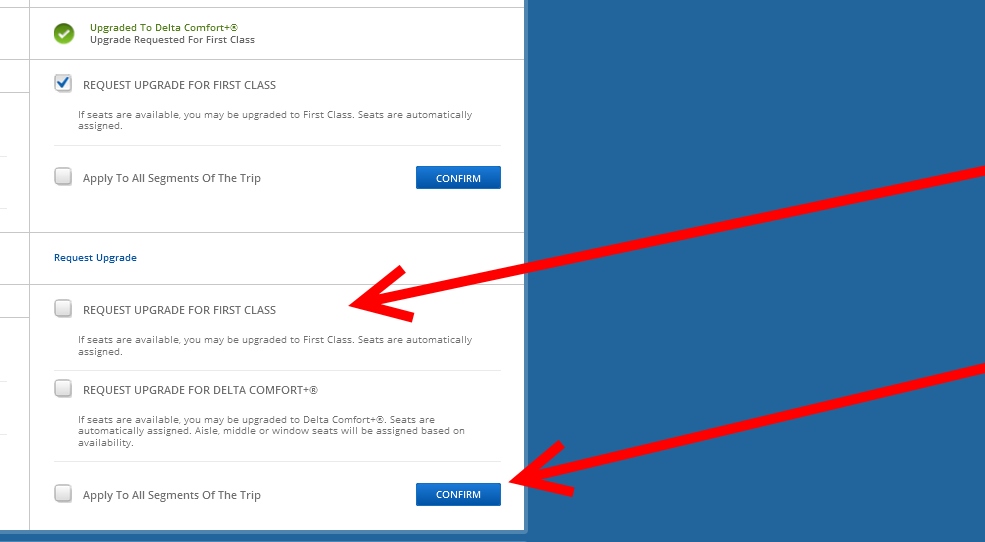 The point is after you have confirmed your seat, then go back to your reservation page on Delta.com and scroll down to the bottom of the page and make sure you once again choose that you DO want a shot at a real 1st class upgrade even though you are now not seated in the C+ section of the jet. – René