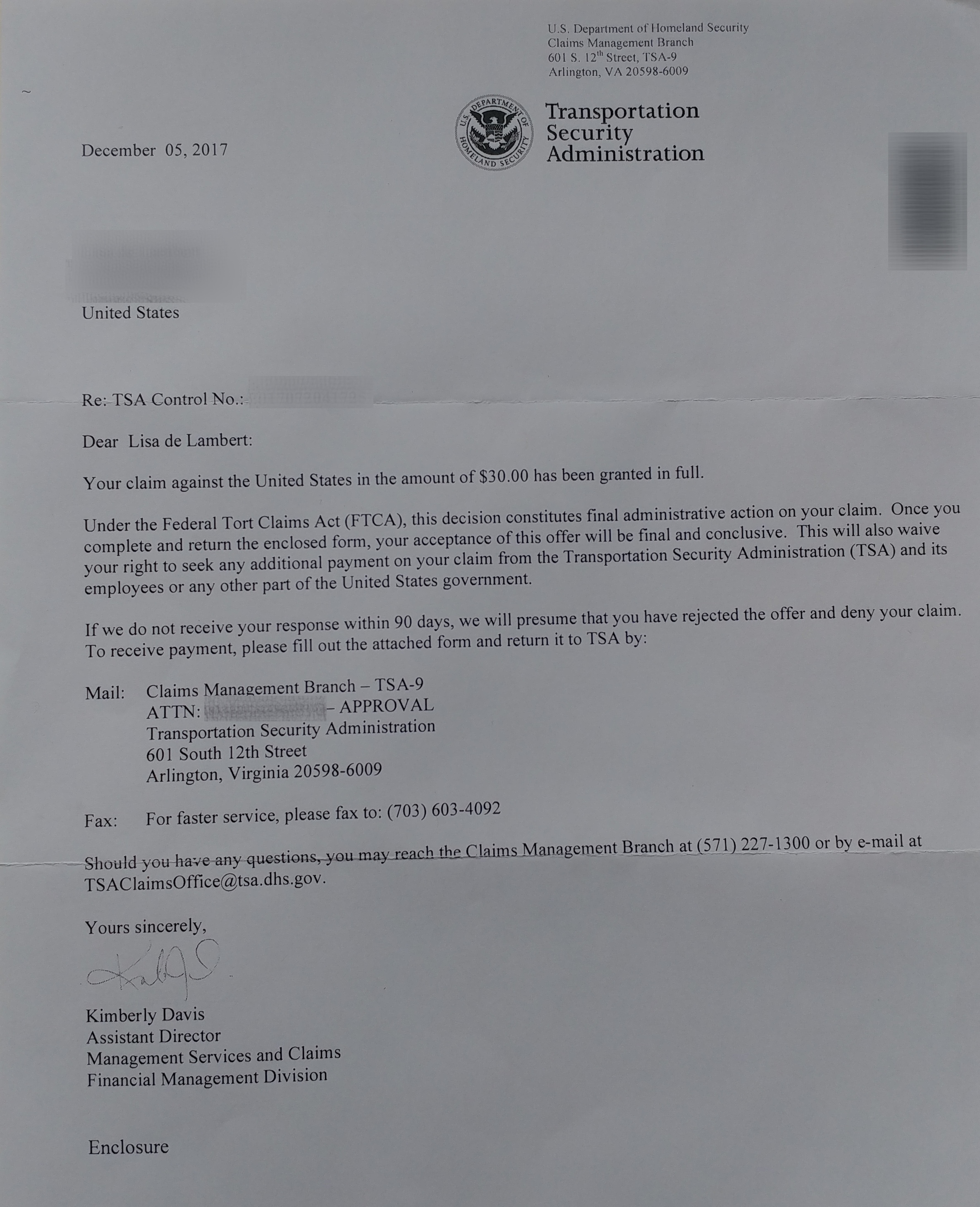 It also included a second form that had to be filled out and mailed or faxed in to get payment because the default, if you do nothing, is that you are “saying” you do not want the payment you requested! Really TSA? But I guess I understand they need you to acknowledge that it settles the claim.