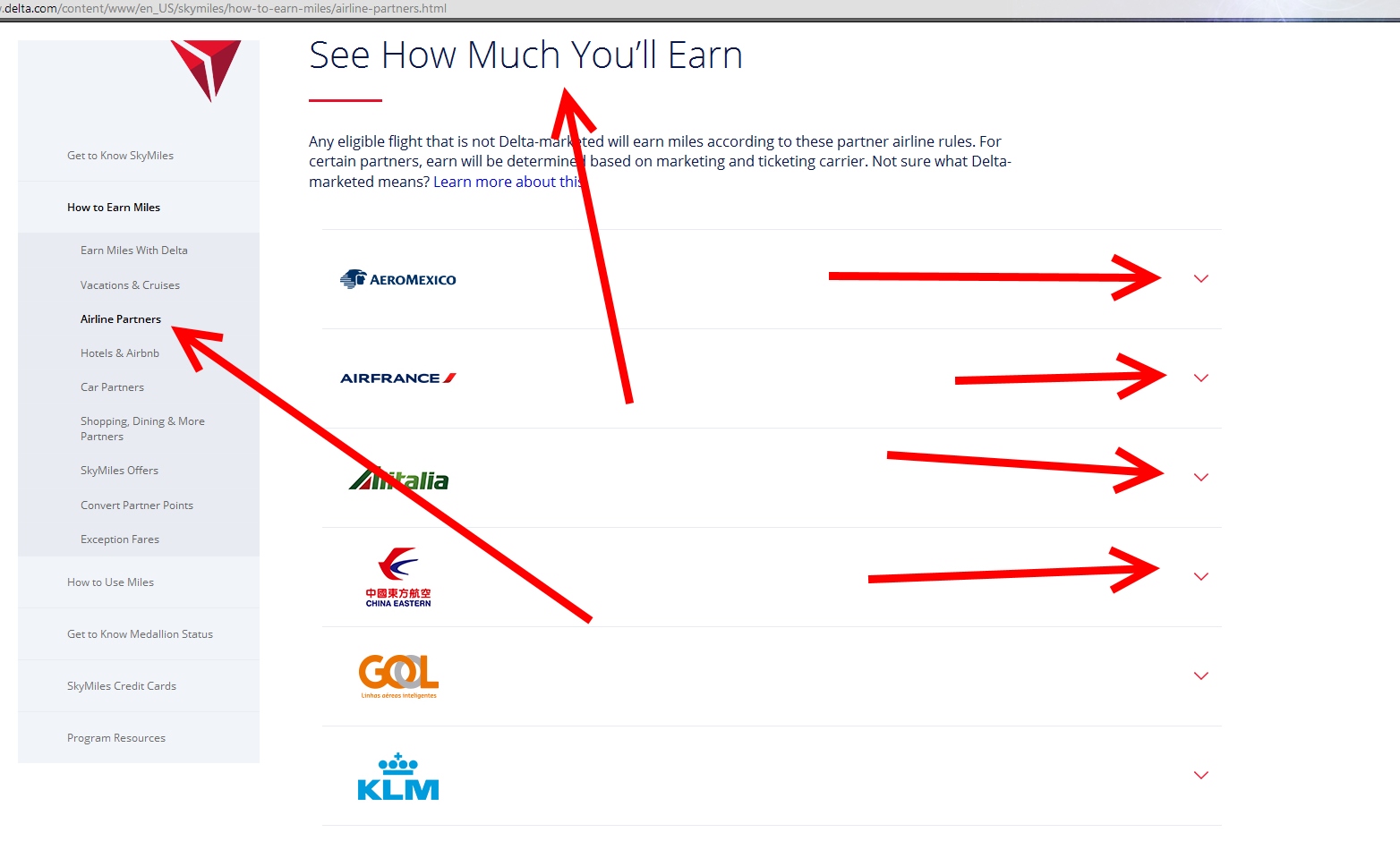 In the above two slides from Delta.com we see where to go and where to click when it comes to partner flights (again, that are NOT code share booked flight). Then when you expand the down arrow for the partner there is a very important box to click.