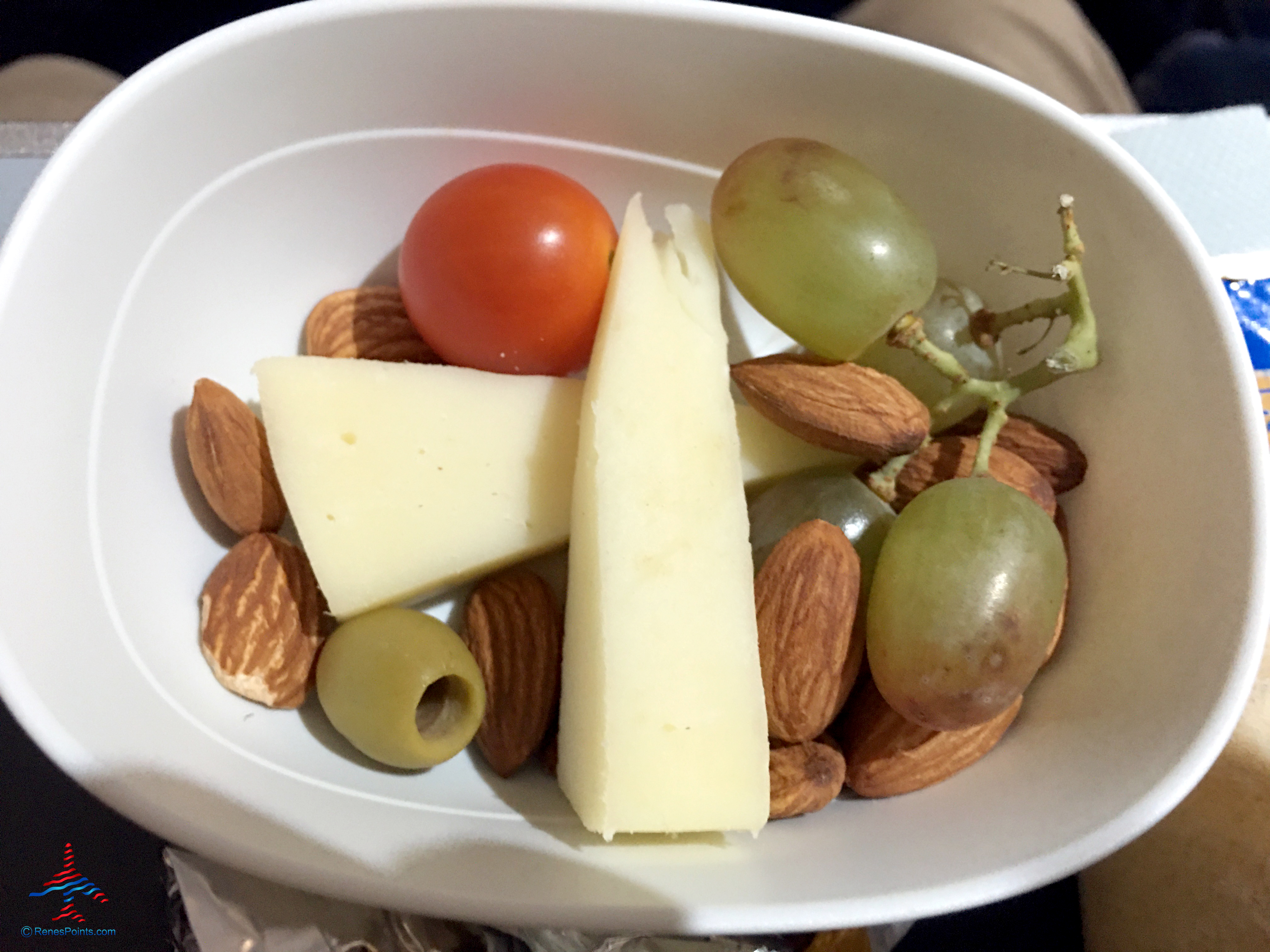 The “fruit” part of “fruit and cheese” consisted of a small tomato and a few grapes. More grapes would have been nice.