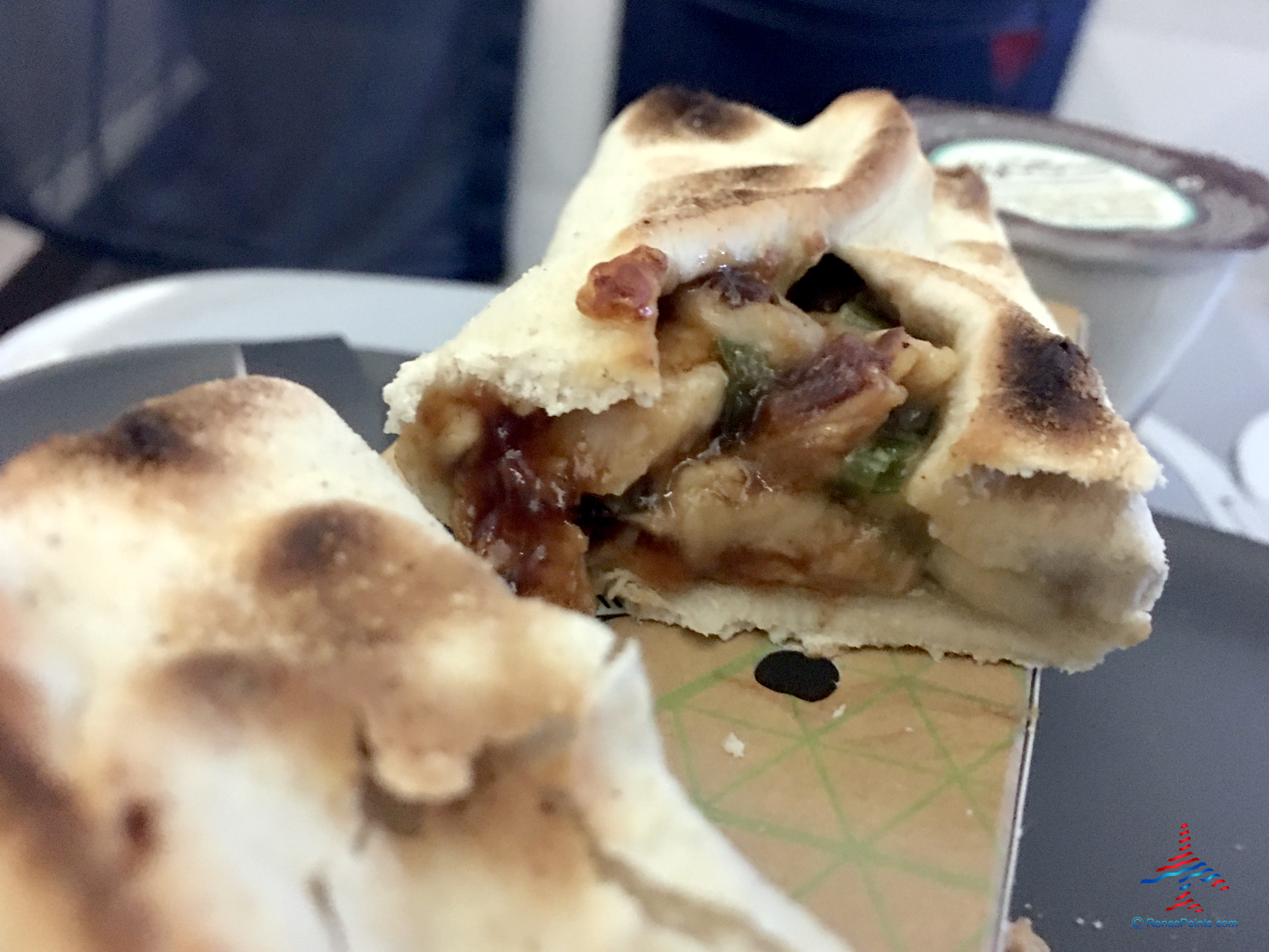 About 90 minutes before landing in Atlanta, flight attendants served us the “Almost There” small meal. I selected the Barbecue Chicken Pizza Twist.