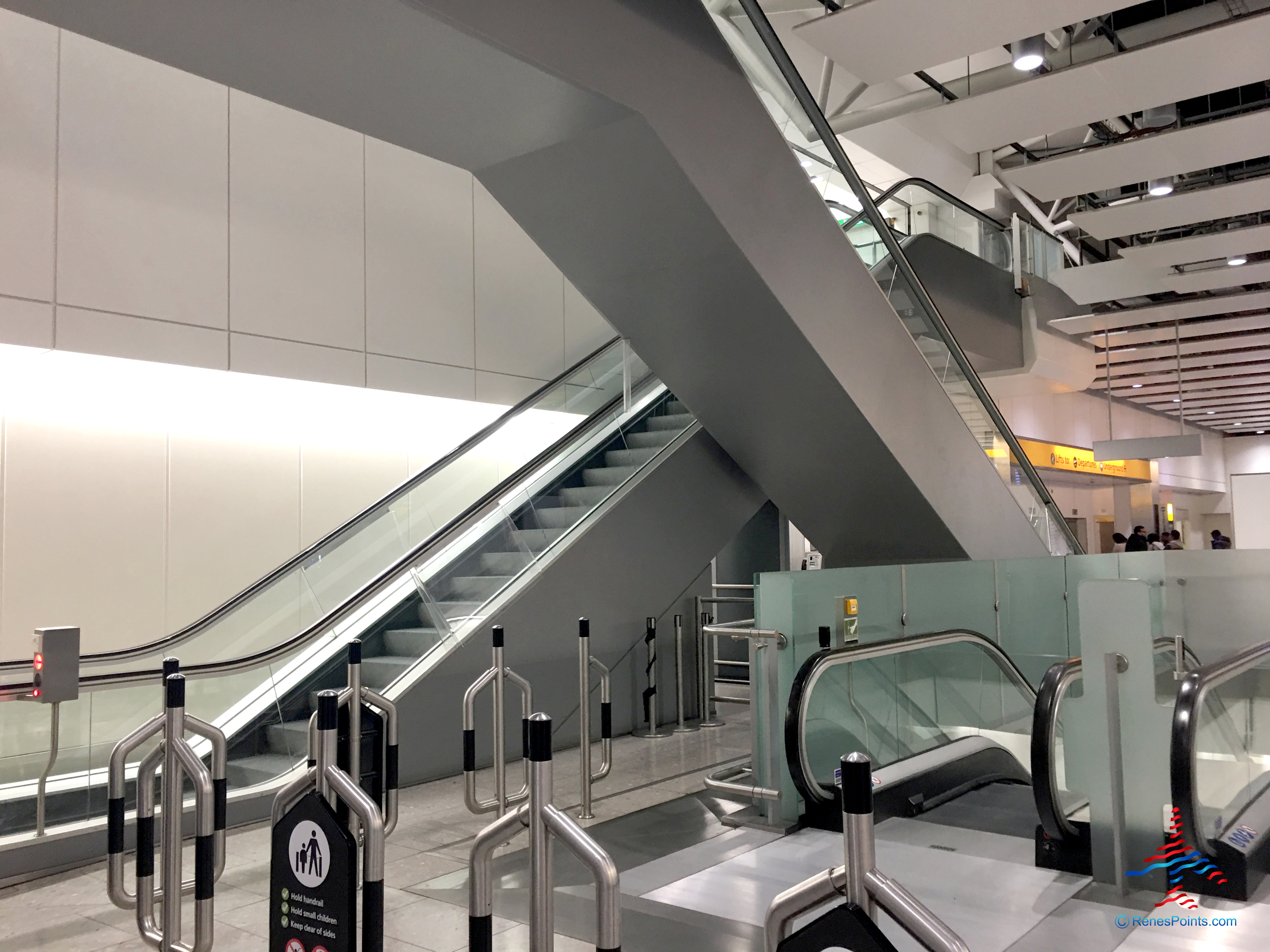 The below escalators are located near the Tube and Heathrow Express entrance on Level 2. They’re near Zones A & B. (Look for the Excess Baggage Co. store and Tourist Services.)