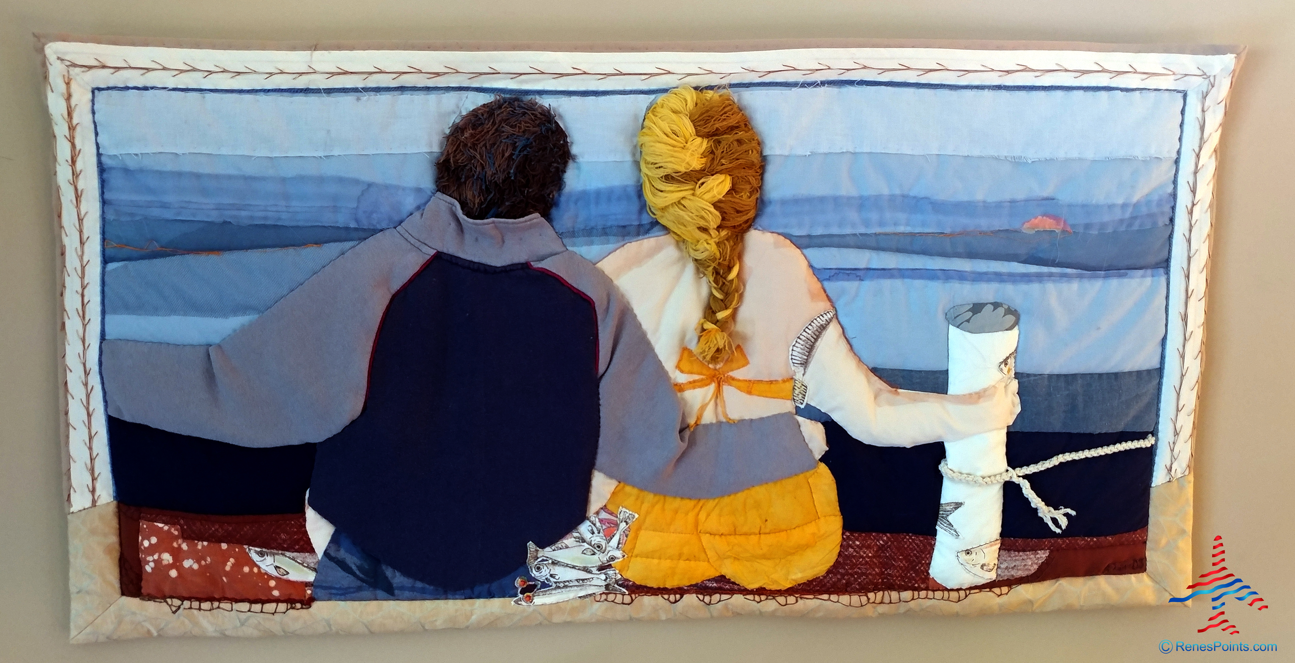 The last one is a gift I treasure from my mom who earned a bachelor’s degree in textile design and created the above of myself and my Lisa sitting on the dock of the summer house in Sweden. Yes, it is a very Swedish summer that I have a coat on and my wife is in a swimsuit!