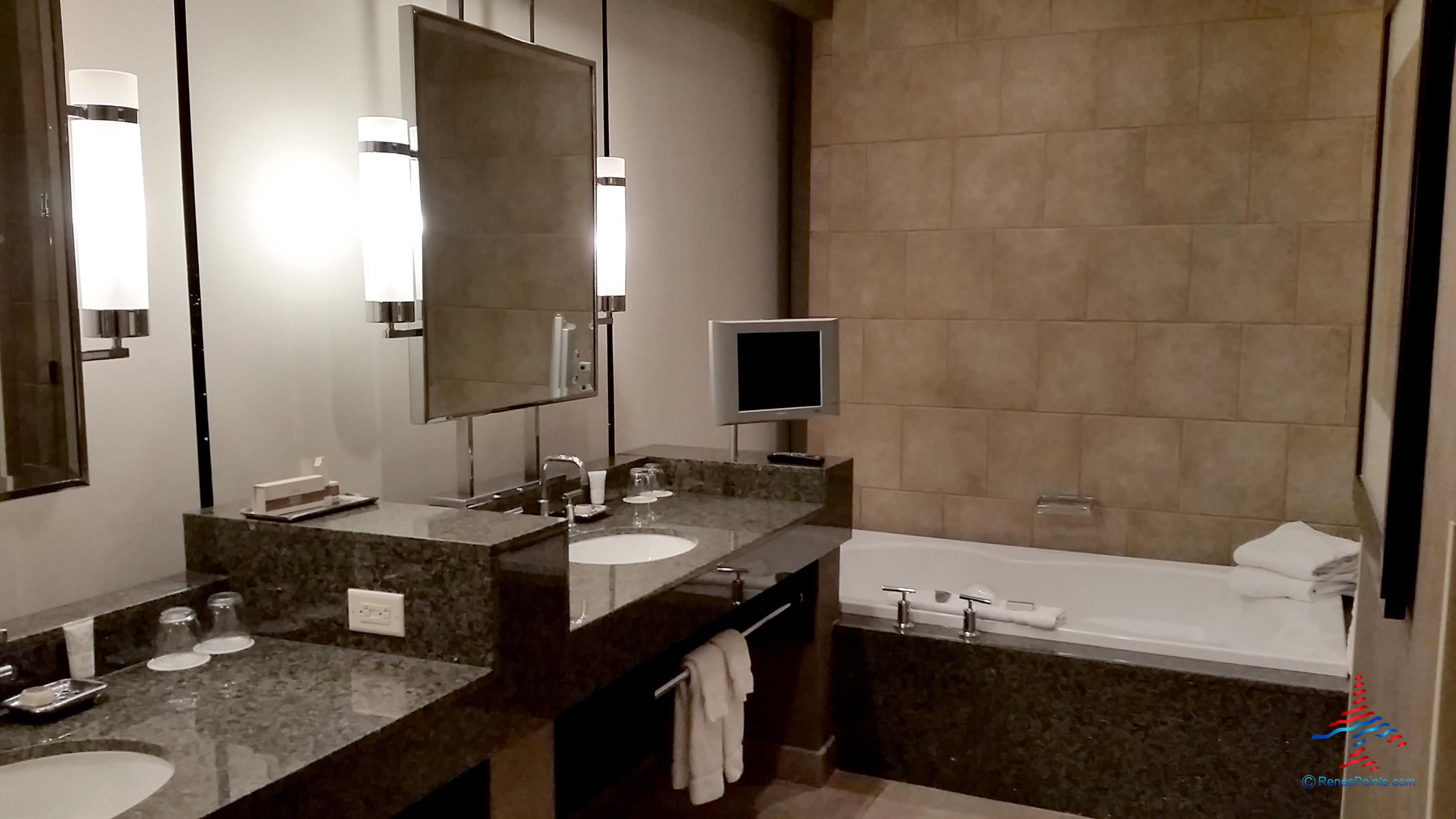 The Salon Suite bathroom features a jacuzzi, two sinks, and a shower. As a bonus, there’s a small, flatscreen television next to the tub.