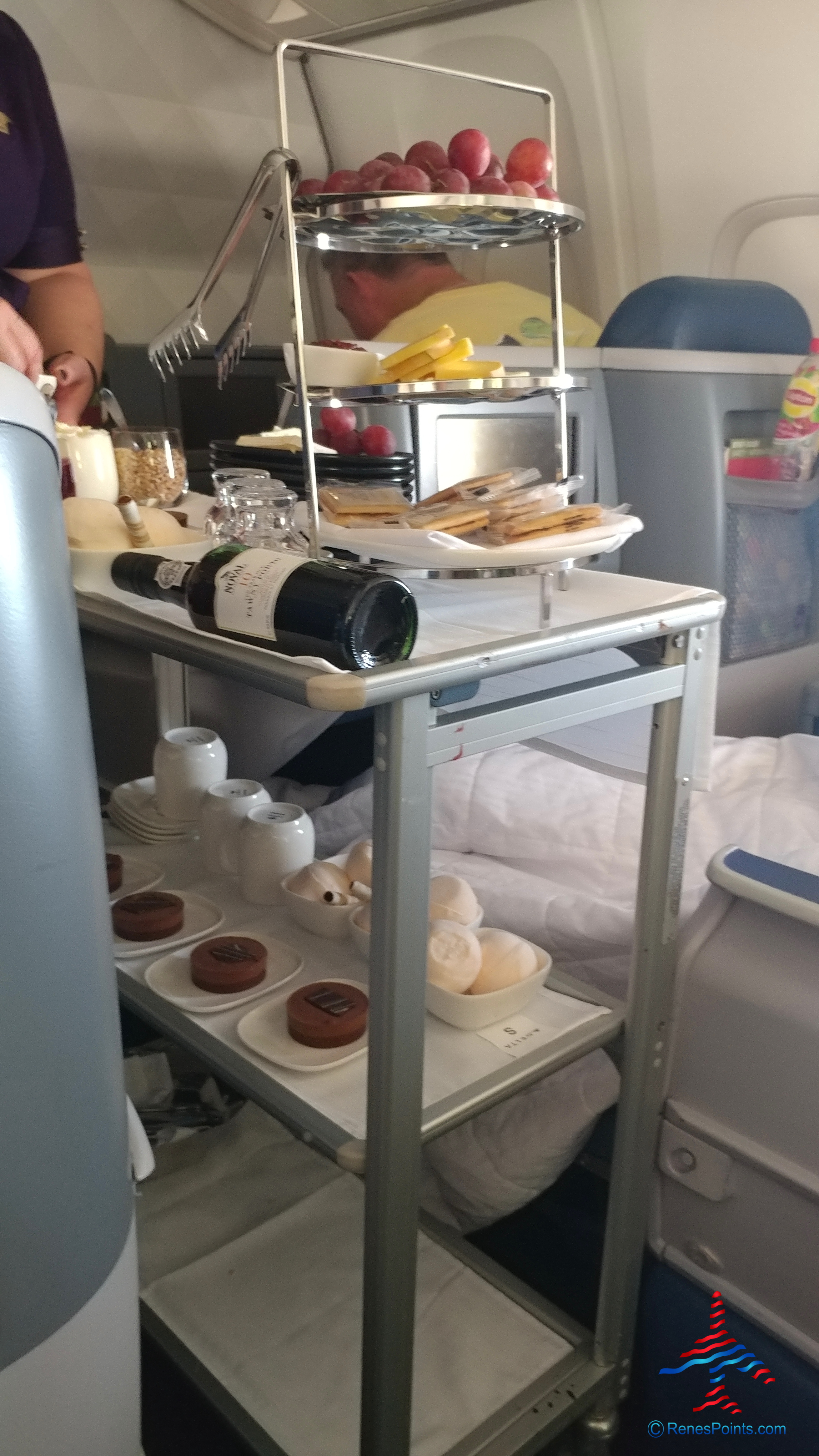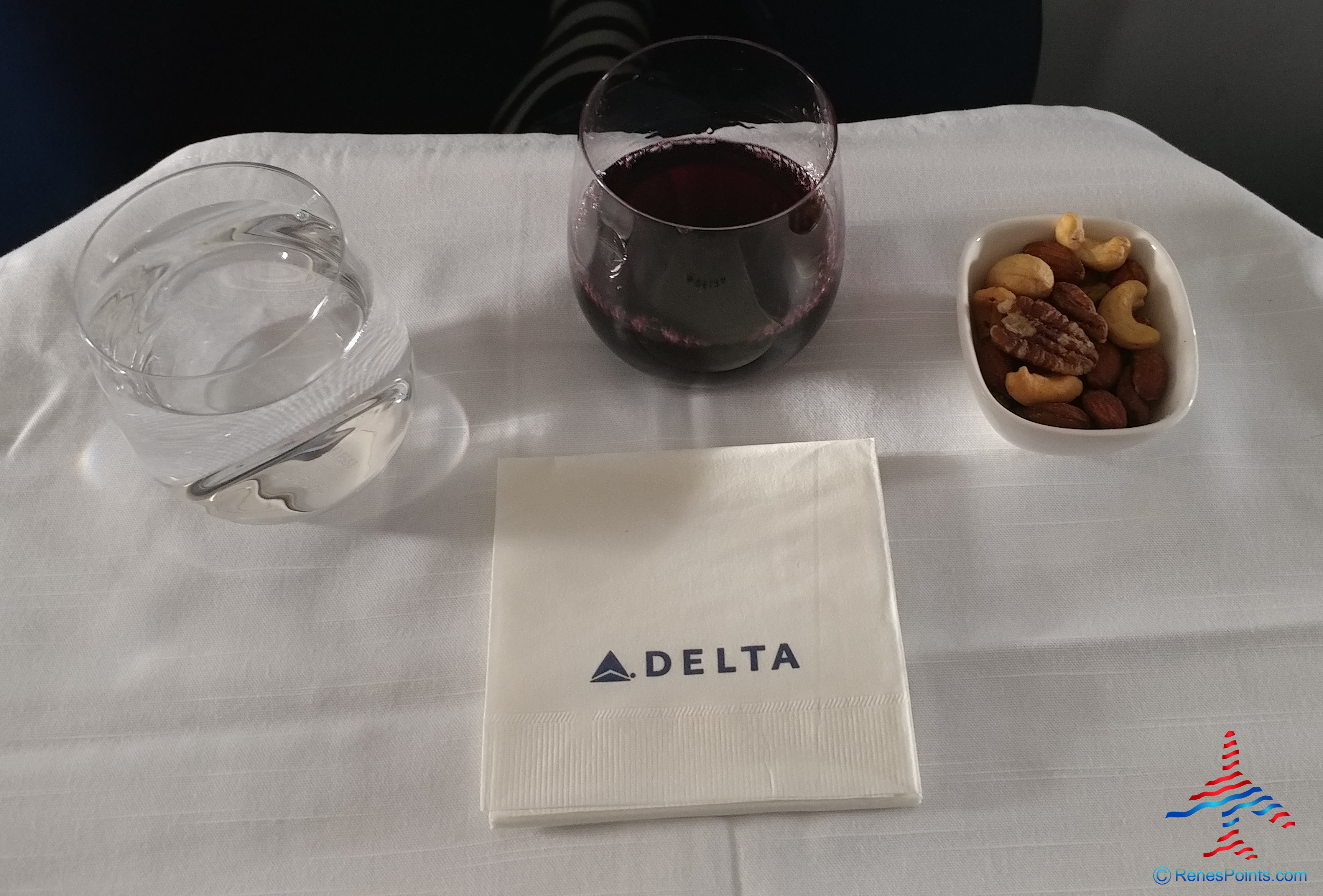 Once near cruising altitude nuts and wine service began. Do notice I choose the shorter water glass for both water and wine as the taller ones tend to be less stable (you simply have to ask).