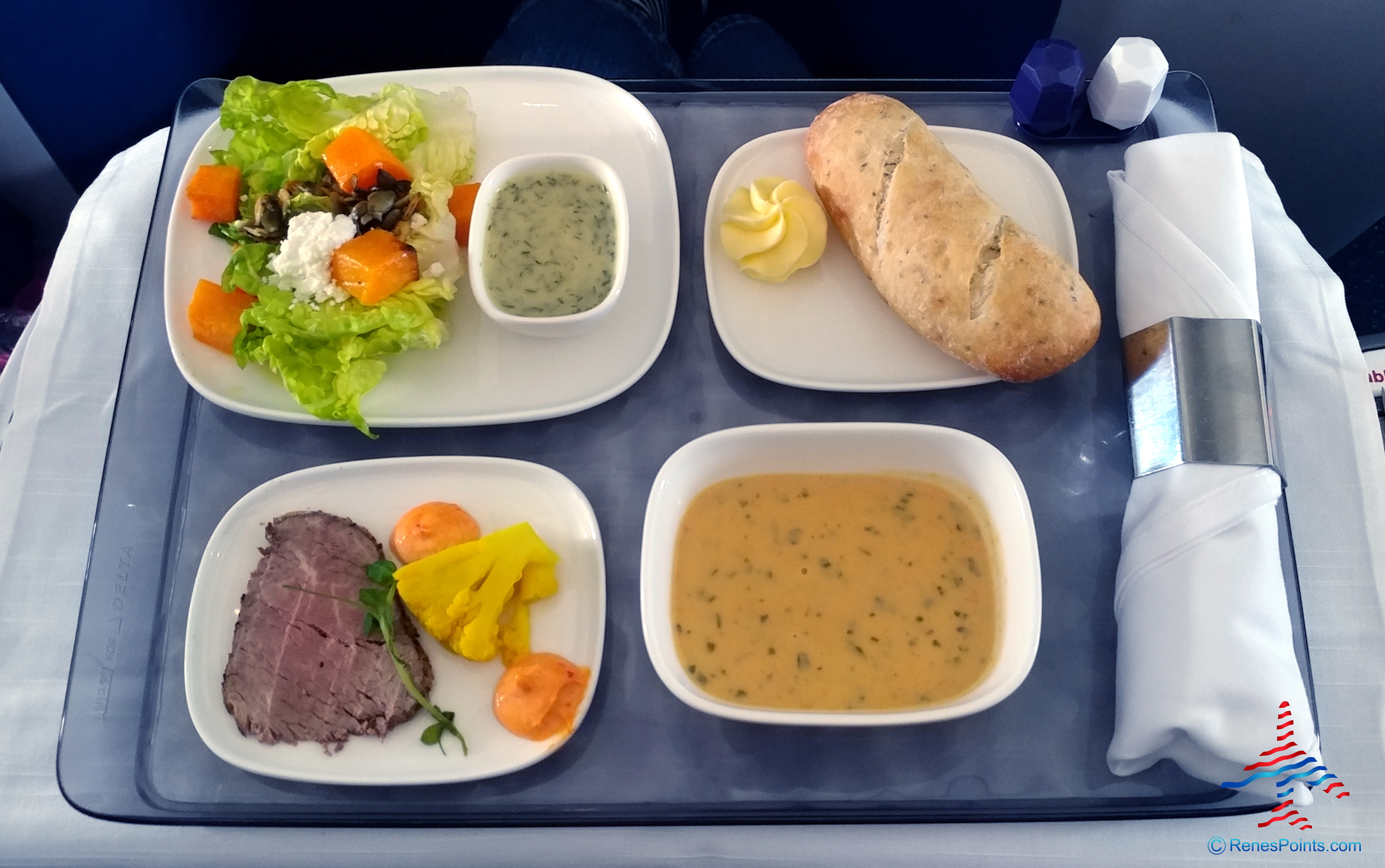 After that soup, salad and appetizer course. All selections are served on plastic trays but I remove them as you do have a table cloth presented as well. Each item was quite good and I am always impressed with Delta First Class and Delta One meals.