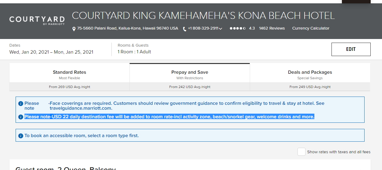 This is what frustrates me most about Marriott. That is not a Courtyard. It looks like a very old property that used to be branded independently or under a competing brand and was re-flagged to Marriott. Even with renovations (it looks like it underwent lipstick recently) it’s not a resort. Having restaurants or other services atypical of Courtyard as a brand just makes Marriott’s portfolio even more confusing. I really don’t understand why Marriott can’t be more consistent in the standards of each brand. It just makes it horribly confusing. It would be like Delta calling first-class 2×2 seating on some planes, but 3×3 on other planes. I also don’t understand why the hotel doesn’t just add $20-$22 to its prices instead of charging a scam resort or destination fee for a property that is by no definition a genuine resort when compared to all of the other resorts in Hawaii.